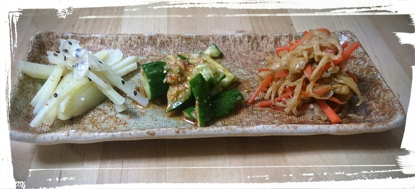で、この本から、じゃがいもの塩ナムルときゅうりの辛漬けを夕食にしました。